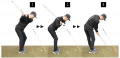 (1)ダウンスイングはグリップエンドをボールに向けながらクラブを引き下ろす。