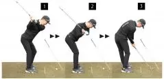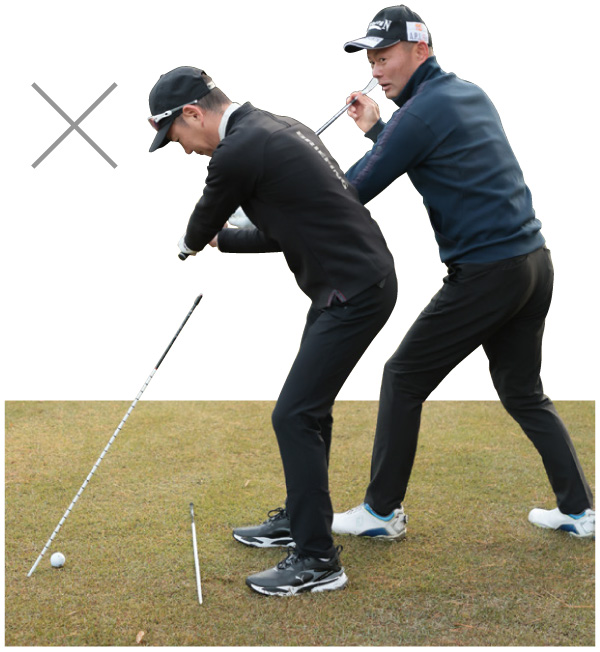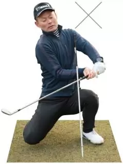 手がスティックに当たらないように振るためには、グリップエンドをボールに向けながらクラブを真下に引き下ろさなければならないので、手元が浮くクセを直すことができます。