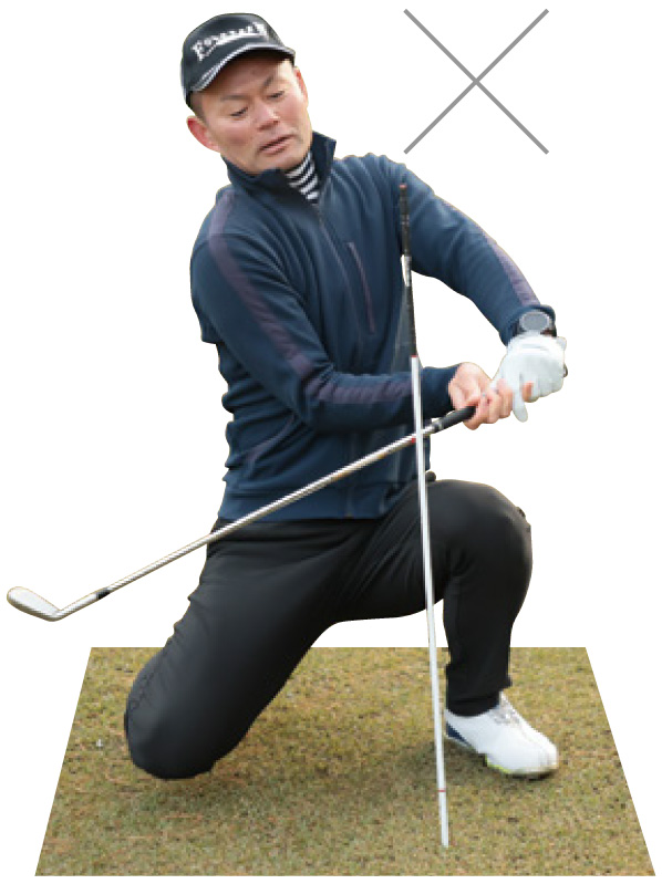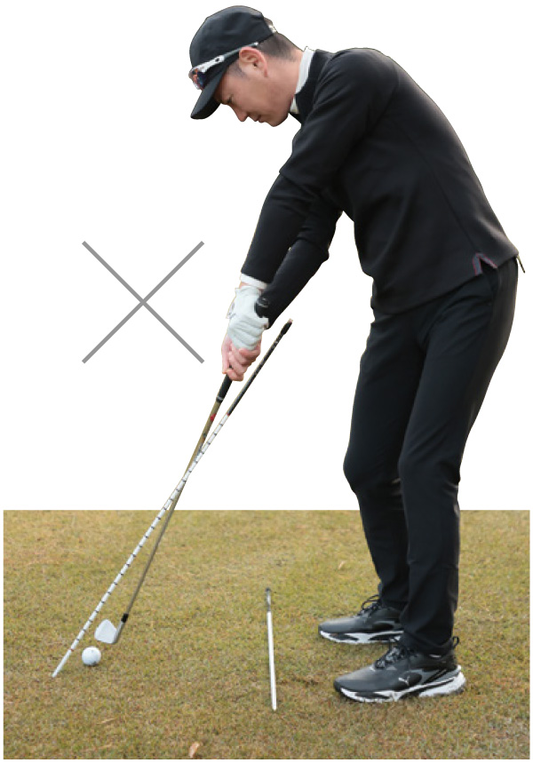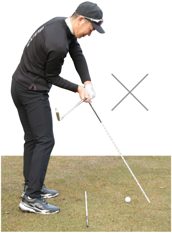 × シャフトが寝てグリップエンドがボールより遠くを指している。