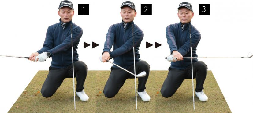 (1)ダウンスイングはグリップエンドをボールに向けながらクラブを引き下ろす。
