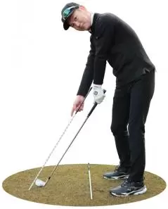 アライメントスティックをアドレスした時のシャフトと平行になるようボールの外側へ斜めに刺したまま球を打つドリルです。