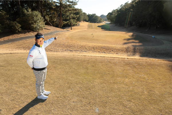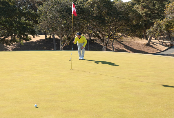 大事なのは、順目か逆目か、芝の向きをチェックすること。なぜならグリーンより芝が長いぶん、ボールとのコンタクトの強弱やコロがる距離に大きく影響を与えるからです。