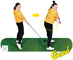 (右)ヘッドが走ってくれれば股関節の角度をキープして腰を回転させられます!
