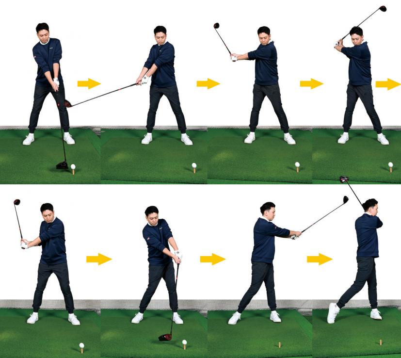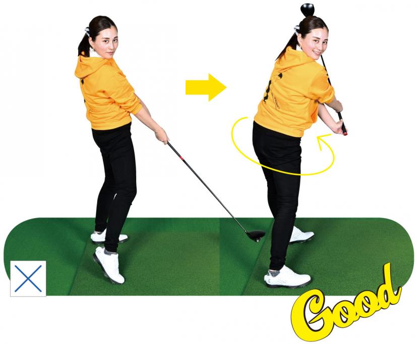 (左)アームローテーションができないとヘッドが遅れて下半身が窮屈に