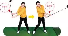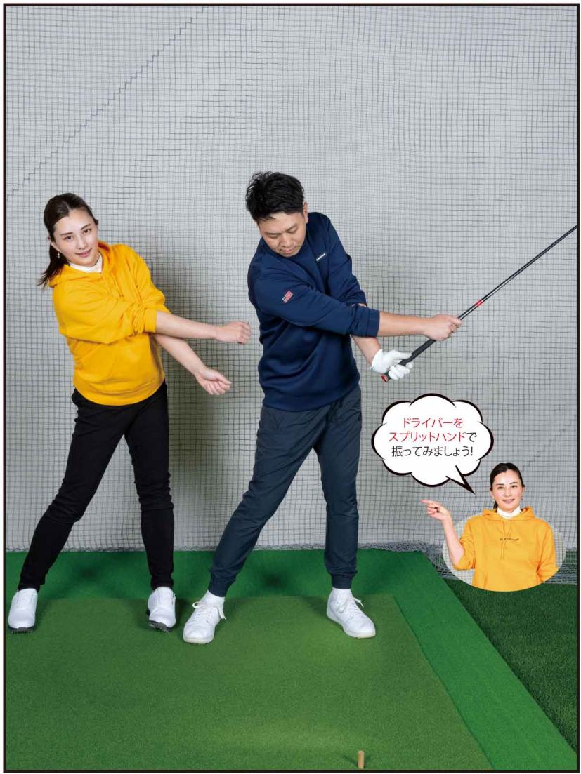 スプリットハンドで素振りする際、手の動きばかりを考えてしまいがちに。繰り返すことでアームローテーションをマスターしたら、キープしようとしなくても、結果股関節の角度がキープされます。ドライバーなど長いクラブでも打点が一定に保ててミスを減らせますよ!