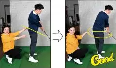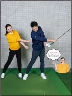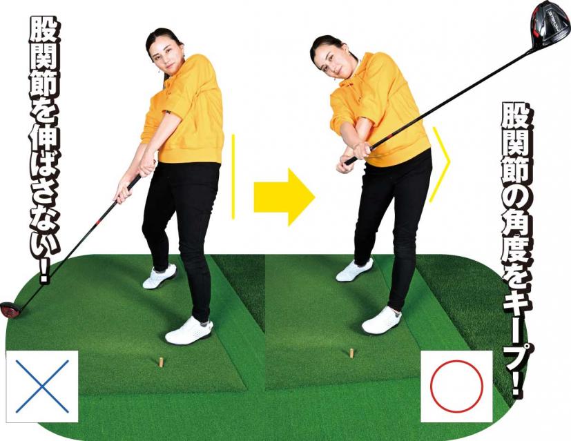 (右)ヘッドが走ってくれれば股関節の角度をキープして腰を回転させられます!