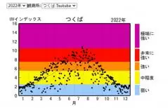 紫外線が人体に及ぼす影響の度合いを示す「UVインデックス」という指標があります。気象庁のつくばの観測地点の月ごとのUVインデックスの平均値を示したのが、下のグラフです。やはり年間では6月から8月が紫外線が強くなります。