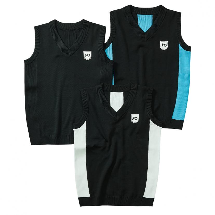ポロシャツとのレイヤードも当然可能、リブ編み切り替えデザインを採用しているので、お洒落に着用することができる。ゴルフシーンはもちろん、普段着としてもOK!