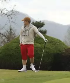決め手は鮮やかなレッドのショートパンツ。これが差し色効果を生み出してオヤジゴルファーを脱却、一気に若々しい印象となります。