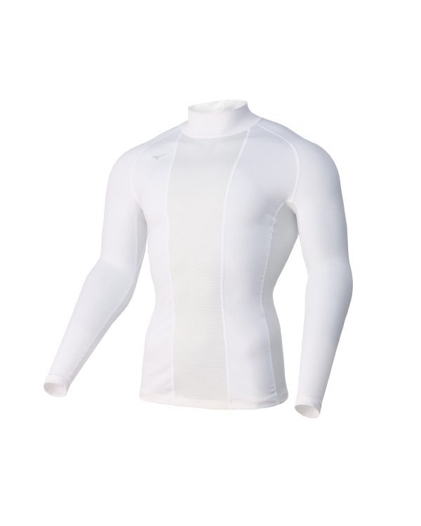 意外と少ないハイネックタイプのアンダーウェア。これはキチンを首元までサポートしてくれるタイプで、ポイントは「クールコア素材」です。この素材は水分(身体から発散する水分など)があれば恒久的にクーリング効果が得られ続けるという画期的な素材。