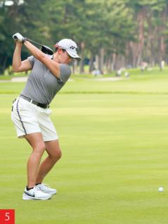よく見るとトップ(写真3)から、ダウンスイング(写真5)にかけて体全体が沈み込んでいます。これはシットダウン(SIT DOWN)という動きなのですが、沈み込みによって体が伸び上がることなく、重心を低くキープできていることがパワフルなスイングにつながっているのです。