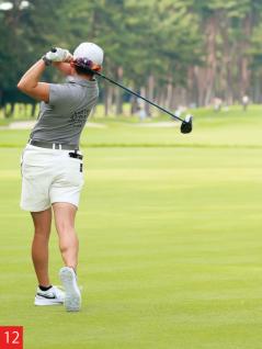 もう1つ、ヘッドスピードを上げるポイントが手元(グリップ部分)の動きです。アマチュアはインパクトの瞬間に手元が最下点になるタイプが多いのですが、明愛選手はインパクトの手前(写真7)で手元が最も低くなっています。そこからインパクトにかけては手元が上がっていく軌道になるので、ヘッドが加速しています。