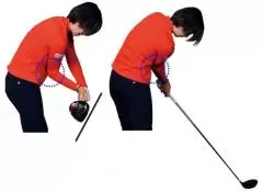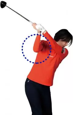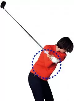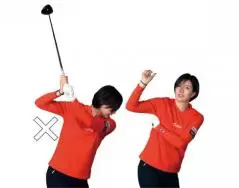 切り返し直後は右ヒジを斜め内側に入れる。右ヒジが体の後ろを通るとシャフトが寝てしまう。