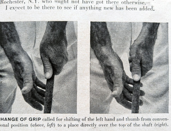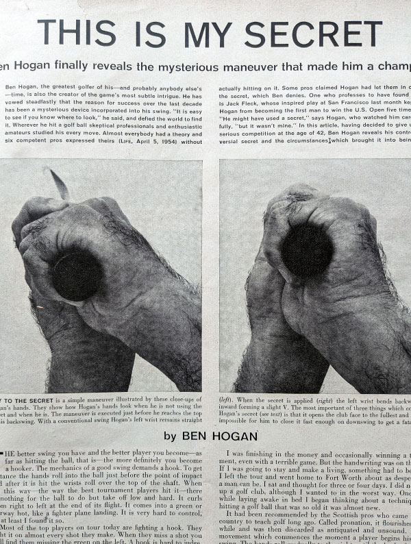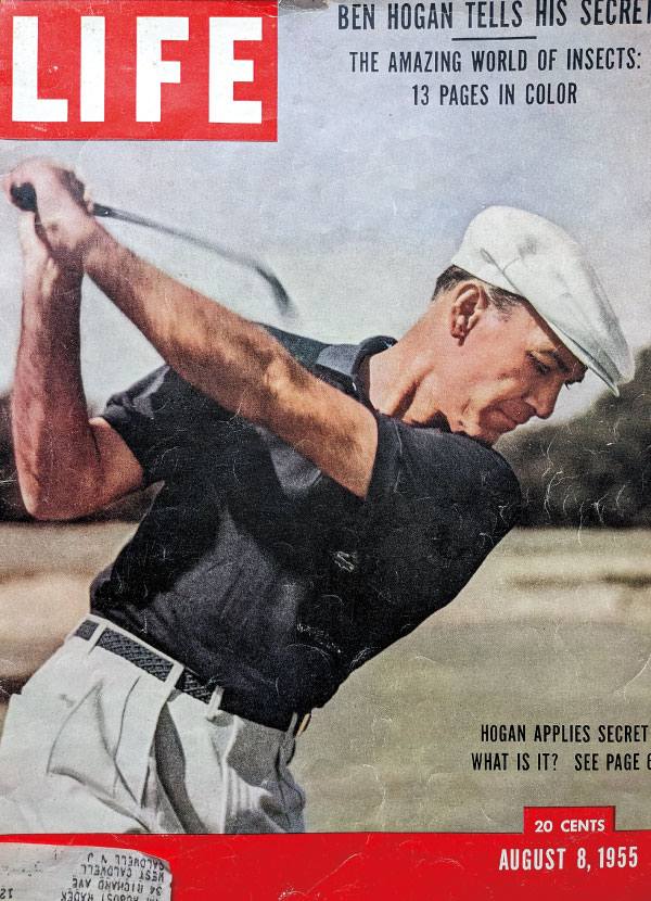 1955年8月8日の「LIFE」誌。「ホーガンの秘密」と題し13ページの特集号。ツアー引退後に、不朽の謎と言われたエッセンスを公開し大反響に。少年時代からの友人バイロン・ネルソンにホーガンのことを聞いたとき「左グリップをややウィークにしたことが彼をスーパープレーヤーにした」と語っていた。以来、僕はこのグリップの写真をながめ続けている。