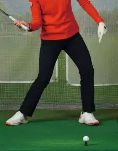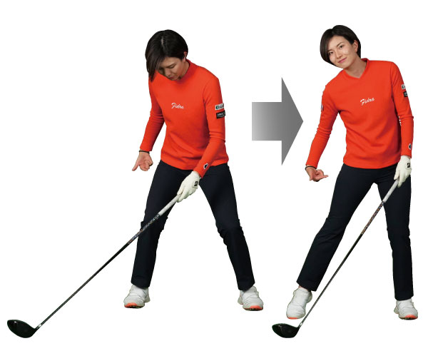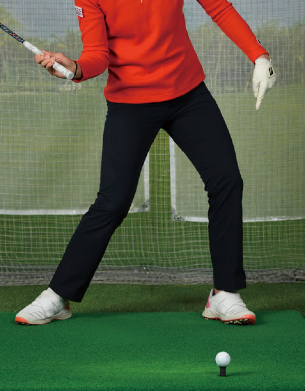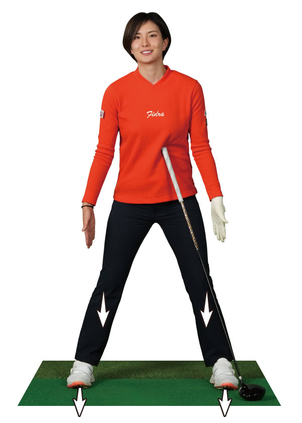 ドライバーのような長いクラブを打つときほど、アドレスでツマ先とヒザを正面に向けることによって下半身が安定する。