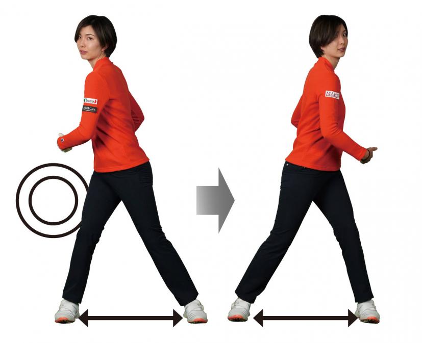 私もドラコン競技をはじめてからスタンスを広くするようになりました。ドライバーの場合は肩幅よりも1足から2足分はスタンスを広げます。左右の足を広げることによって股関節を大きく動かせるので、上半身の回転スピードを上げやすくなります。