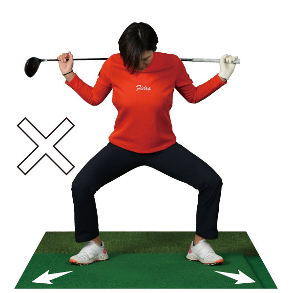 ただし、スタンスを広げるときに気をつけないといけないのはツマ先を開かないこと。ツマ先は真っすぐになっているのが鉄則です。