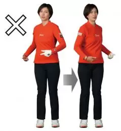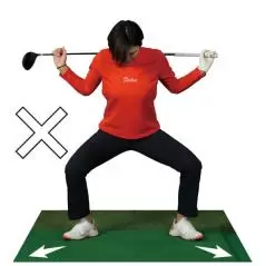 ツマ先を広げているとダウンスイングで左足を踏み込んだときに、ツマ先が開いた方向に力がかかってしまい左ヒザが流れる原因になってしまいます。