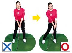 (写真左)空中で振ってから地面に下ろしアドレスすると