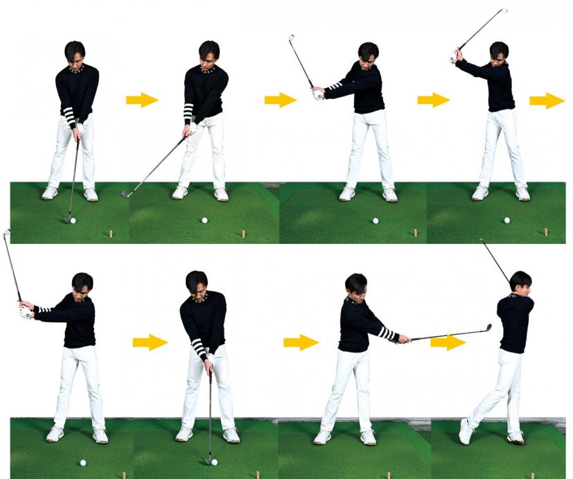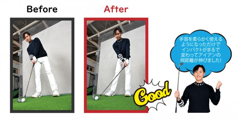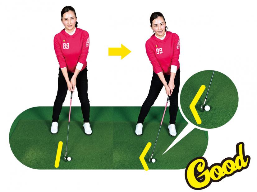 (写真右)インパクトでは自然とハンドファーストになりフェースはスクエアに!