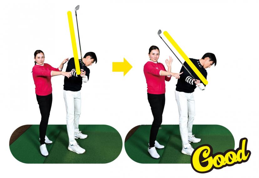 (写真右)手首を柔軟に可動できればシャフトは斜めに下りてくる!