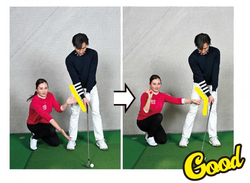(写真右)右手首の角度の深さはこのくらいがいい!美しいハンドファーストに!