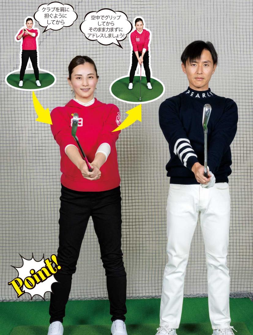 (写真左)空中で振ってから地面に下ろしアドレスすると