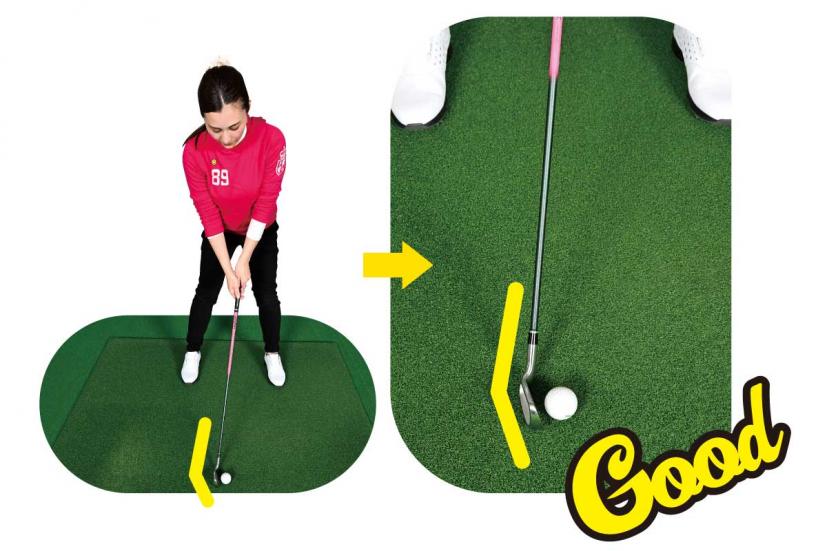 マットのヘリを跨ぐようにアドレスし、クラブヘッドをマットのヘリに引っかけます。そこからグリップしている手を飛球線方向へ引いてみます。手が左太モモの前へ来るあたりで静止してみましょう。それが、ハンドファーストのインパクトのカタチです!