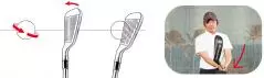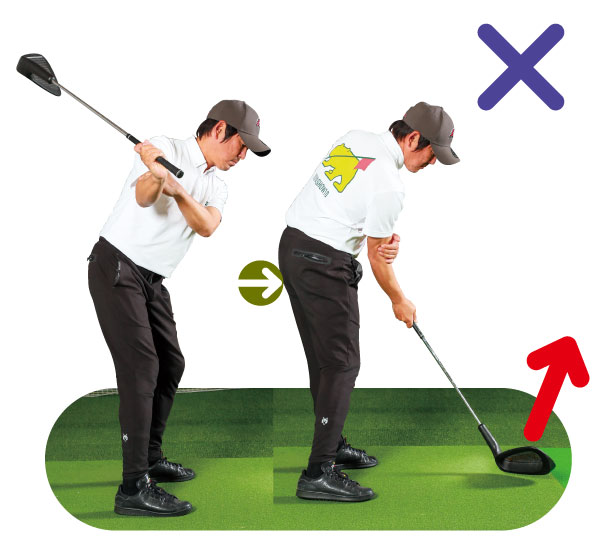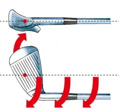 早い段階でヒールがヘッド重心のプレーンから離れているため、ヘッドに逆回転の負荷がかかりやすい。ヒールを下げ続ける動きを維持するため、ヘッドを加速し切れない。