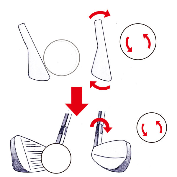球を包み込むようにフェースを“順回転”させることで打球はラインに押しこまれ、タテのスピンがしっかりかかり(上)、伸びる強弾道になります」