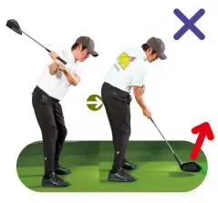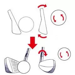 ヒールを下げて、シャフトをプレーンからかわす動作が入らないと、運動連鎖で加速したヘッドはヒールが先行したまま。