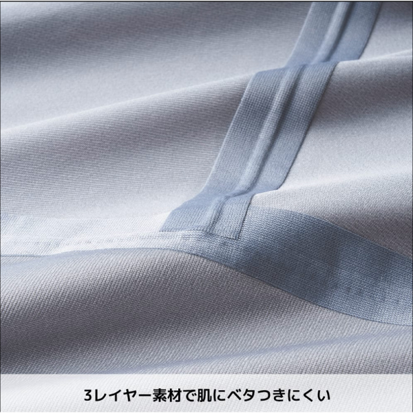 裏地は肌にべたつきにくい素材を用いた3レイヤー(3層構造)。快適な着心地を実現。