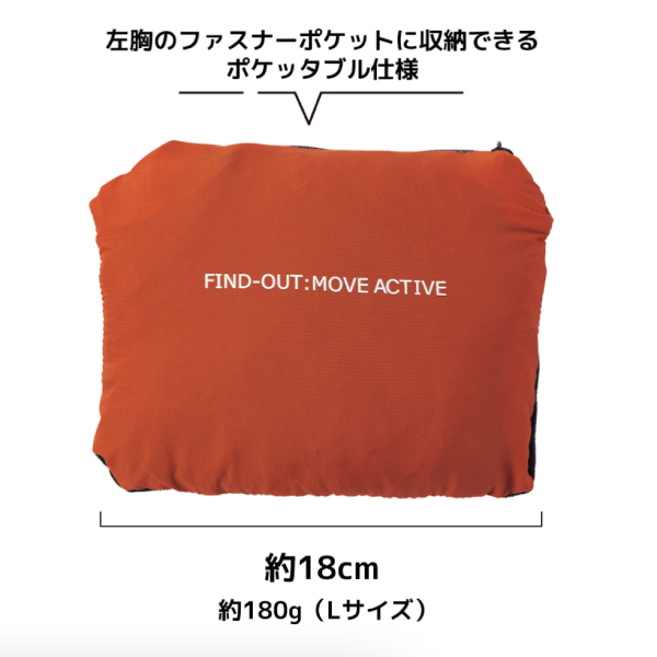 左胸ポケットにコンパクトに収納できるポケッタブル仕様。Lサイズで180グラムと非常に軽量。
