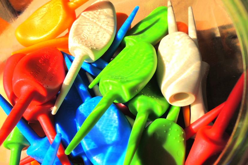 改めて見てみると、ティは多様です。長さは長短ありますし、シンプルな釘状のものから画鋲を逆さにしたような形状まであり、挿すのではなく置くタイプなど何種類もあります。素材もいろいろ、カラーもたくさんあります。