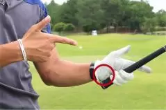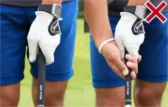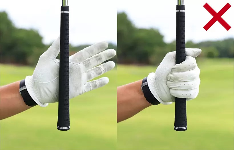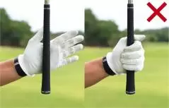 ところが左手の握りがルーズな人がとても多いのが実情です。その典型がグリップを手のヒラでワシづかみするパターン。野球のバットよりも細いグリップを手のヒラで握ると手や腕に余分な力が入りやすく、手首やヒジなどの関節も硬くなり、クラブをスムーズに振りにくくなってしまいます。