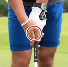 そして、もう一つ大切なポイントは左手も右手も親指と人さし指のツケ根を締めておくこと。親指と人さし指のツケ根があいているとグリップがルーズになり、スイング中にグリップが緩んでフェースの向きが変わったり、スイング軌道を狂わせたりしやすく、ミスショットの原因となります。左手の親指と人さし指のツケ根を締めれば指で握りやすいですし、さらに右手の親指と人さし指のツケ根を締めて握ることで両手の一体感が生まれます。