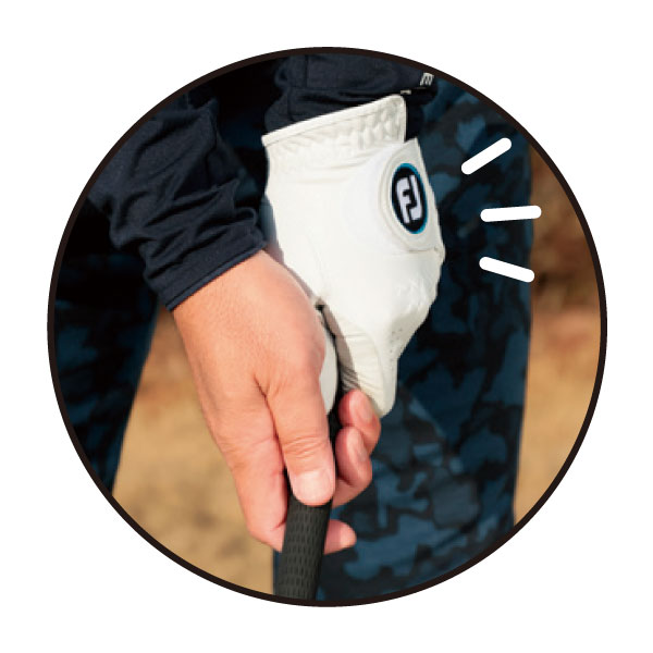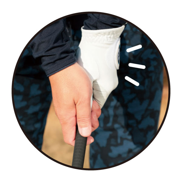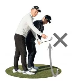 蕪木さんのようにウィークで握っているとコッキングがしづらく、クラブがインサイドに上がりません。左手の握り方をフックグリップにしてバックスイングで左ワキを締めれば、自然にコックが入るのでイン・トゥ・インの軌道で振れるようになります。