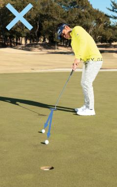 最初が肝心で、下りのラインから始めるとボールが速くコロがるぶん、どうしてもタッチが弱くなってしまいます。その感覚や先入観が頭や体に残ると、本番でショートしやすくなるので注意してください。