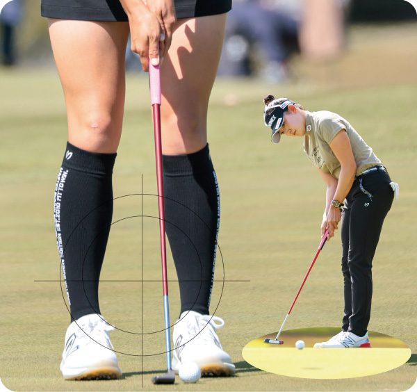 「ボールの位置や手の位置など、パターこそスタート(アドレス)が全部、毎回一緒じゃなきゃダメなんです」という古閑。岩井と同じく狭めのスタンスを取り入れていた理由はここだという。