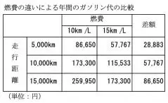 資源エネルギー庁が発表している7月10日時点のレギュラーガソリン1リットル当たりの店頭現金小売価格は173.3円。燃費の違いによる年間のガソリン代を比較したのが、下の表です。