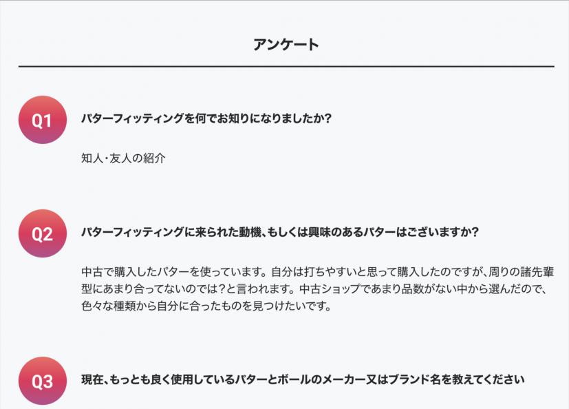 事前アンケートではパターの打ち方のほか、ラウンドの頻度、パターに関する悩みや苦手な点についての質問も。
