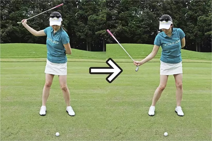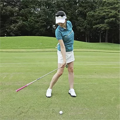 両手でクラブを通常に持ち、ボールを打つときも右手スイングのように両手首を柔らかく使えばダウンブローに打てるようになります。すると結果的にインパクトでフェース面がアドレスよりも少し立ってきます。「インパクトはアドレスの再現」といいますが、インパクトでフェース面を構えたときと同じ状態に戻そうとするのはNG。クラブヘッドが減速して、ダウンブローに打てなくなるからです。アドレスでは両手をカラダの中心線よりも少し前の左モモのツケ根の前にセットして軽くハンドファーストに構えましょう。そしてインパクトでは腰が回転して左腰が左足の前となり、体重が左足に多く乗ってきます。両手が左モモの前で、構えたときよりもロフトを立てる(ロフト角を減らす)つもりでインパクト。このポイントを頭に入れておきましょう。