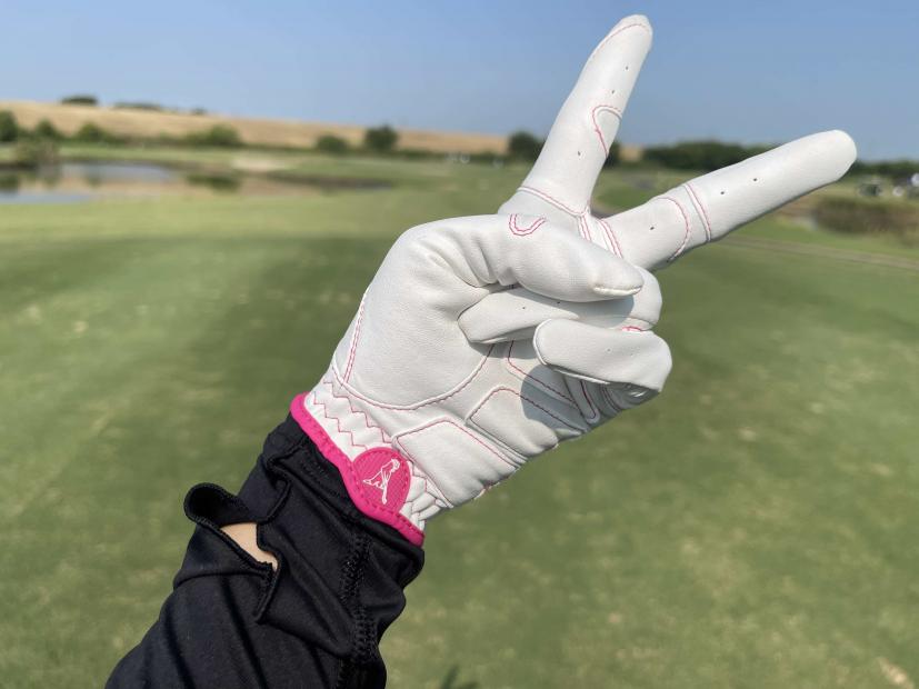 この日のウェアは全身ピンアパレル。かっこいい女性ゴルファーっぽく、トップスは白、スカートはブラックでシンプルに合わせてみました。