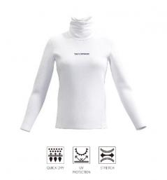 高めのややルーズな襟がスタイルに変化をつけるモックネックシャツ。生地素材には中厚地の吸水速乾素材を採用。