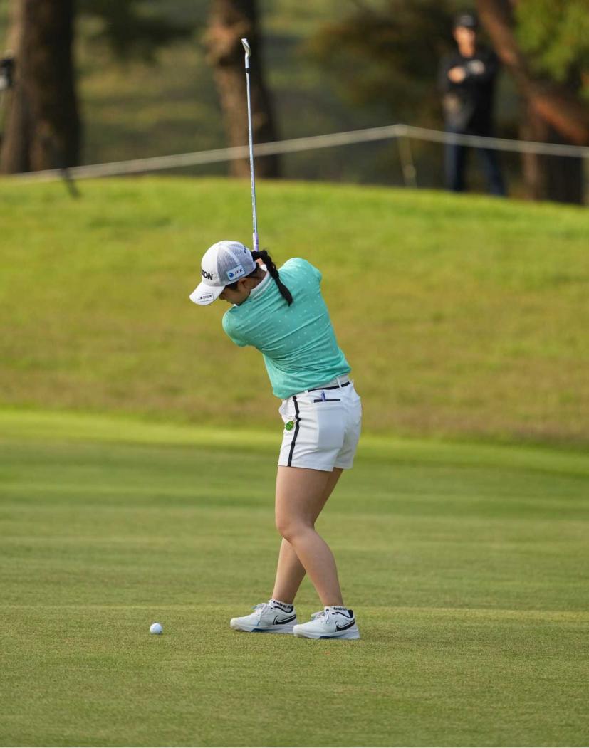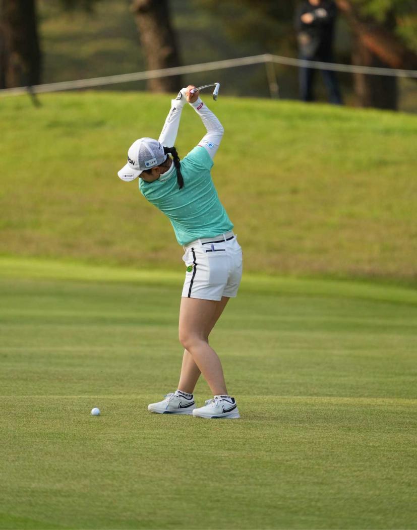尾関彩美悠のアイアンスイング(斜め前方)|フォロー①