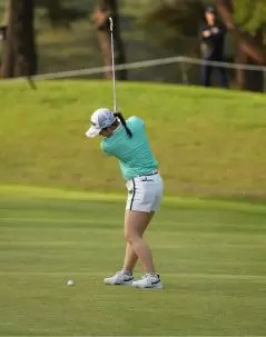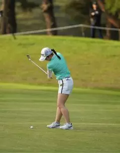 尾関彩美悠のアイアンスイング(斜め前方)|インパクト