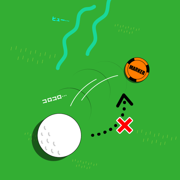 もし、マークする前に風で転がってカップに入った場合は、カップイン(パー4でグリーンに乗せたショットが2打目ならイーグルになります)が認められます。