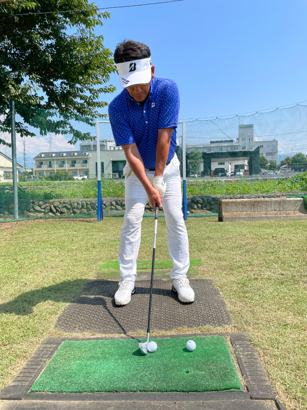重田プロ 「ダウンブローをマスターする方法やドリルはたくさんありますが、ボクは左足のツマ先の前にボールを置いて、それを打つドリルをおすすめします。