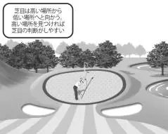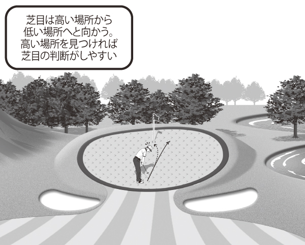 芝目が分からなければ、そのコースの地形的に一番高い場所を見つけましょう。芝目は高い場所から低い場所へと向きますから、近くに山があれば山を背にして順目となります。