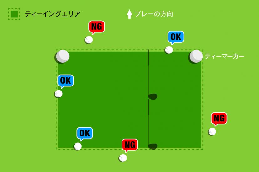 プレーヤーはティーイングエリアの中にボールをティアップ、または地面から直接プレーしなければなりません。ちなみに、ティーイングエリアの中にボールがあれば、プレーヤーはティーイングエリアの外側に立っても問題ありません。